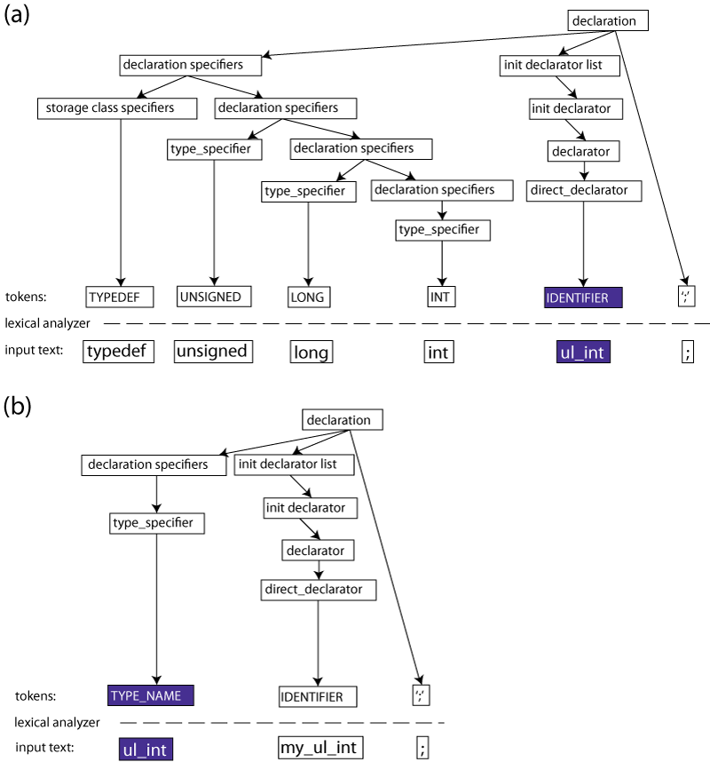 ulint_t must be tokenized not as an IDENTIFIER (as before), but as a TYPE_NAME. The syntax tree of this declaration is in Figure 2(b).