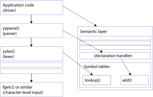 This leads to the structure in Figure 3a call graph representing the simplified structure of a front-end developed with flex and bison. The application-specific code calls the parser (traditionally, function yyparse()) just once to parse the entire input. The parser calls the lexer (function yylex()) as many times as there are input tokens in the input text. Every time the parser recognizes a syntax rule, an appropriate semantic action is triggered. If a declaration is recognized by the parser, the corresponding action adds a new entry in the symbol table. The new entry is visible to the lexer the next time it is invoked to fetch the following token, and it may influence whether the token is categorized as IDENTIFIER or TYPE_NAME.