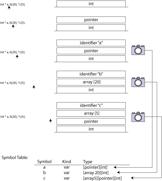 My approach maintains a stack of type records in each block, which describes the state of the current declaration. When each element in a declaration (type record) is parsed, according to the correct precedence implied by the grammar rules, it is pushed onto a stack. Whenever a direct declarator identifier is encountered, a snapshot of the current type stack is taken, saved into the symbol table of the current block, and associated to that identifier. Figure 4 illustrates this mechanism.