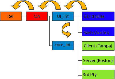 In Figure 1, there are four development teams as well as an area for accepting third-party code drops. Each of the teams are located in a different geographical area. Another level of the hierarchy that is not shown are the individual developers that are working in each team. The hierarchy represents the normal flow of changes through development from stage to stage. For instance, changes in the GUI team flow from individuals to the GUI stage to the UI_int stage, to QA, and finally to the release stage. Conversely, changes merged from the GUI stage to the UI_int stage are also applied to the Web stage and changes merged from the Web stage to the UI_int stage are also merged into the GUI stage.
