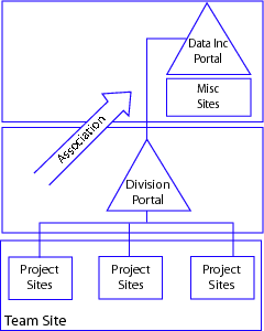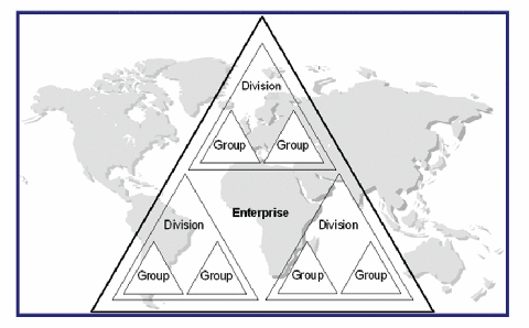 Borrowing from the Data Inc. example, a shared services infrastructure can be deployed at a single central location in concert with multiple shared service farms globally, ultimately creating redundancy should any problems occur. Figure 2 shows a typical deployment that includes three shared services farms at the enterprise, divisional, and group levels.