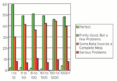 Respondents were asked what they felt about the quality of their production data. Figure 2 summarizes the results by IT organization size. Data quality is highest within smaller organizations, presumably because they haven't had time to make serious mistakes and/or because they've adopted modern database development techniques. An interesting trend is that quality drops the larger the organization gets, until about the mid-sized organization level, where quality starts to rise again. My guess is that mid-size organizations can still survive with a little bit of "data chaos", but eventually, an organization reaches a certain size and needs to start to improve its data management approach if it's to survive.