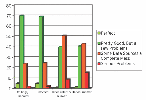 Figure 3 depicts the correlation of various approaches to data naming conventions with data qualitythis is important because it is an indicator of the health of the relationship between the data management group and developers. The survey showed that when developers willingly followed the data naming conventions, data quality was better than when the conventions were enforced by the data group. Both of these approaches were much better than having inconsistently followed conventions, which in turn, was better than having no data naming conventions at all. (At www.agiledata.org, I describe a collection of strategies for promoting a more effective, collaborative relationship between data professionals and developers.)