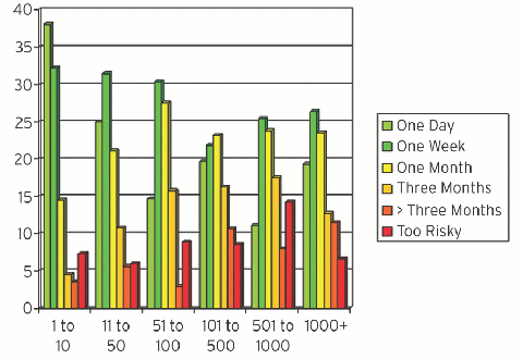 When I speak about agile database development techniques at conferences, I like to ask the audience whether they could successfully rename a column in a production database and deploy that change within a day. Many people in the audience laugh because they know that their organization is unable to accomplish this obviously trivial task. I asked a similar question in the survey, and the results are summarized in Figure 4 by organization size. Interestingly, once again we see the same trend from Figure 2.