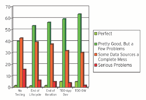 In the September survey, 66 percent reported that they do some form of database testing. In the July survey, I asked about database regression testing, a more complicated form of database testing, and found that less than half of respondents do that form of testing. Figure 5 depicts the relationship between various forms of testing and overall database quality. Many respondents indicated that they take more than one approach to database testing, so the results are commingled. The organizations that do no database testing at all seem to be in the worst shape, which should come as no surprise. Testing at the end of the lifecycle is an improvement, but appears to be the least effective time to testapparently we need to rethink traditional approaches. Testing at the end of each development iteration is more effective still, but taking a test-driven design (TDD) approach appears to be the best approach.