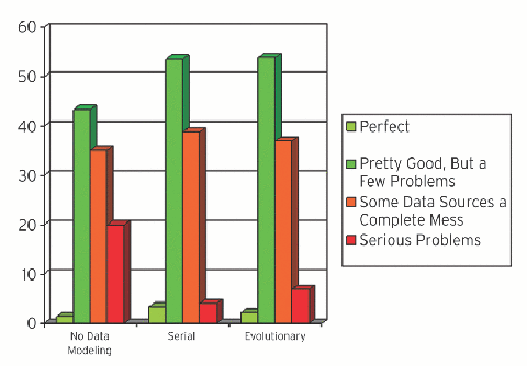 The survey also asked about the approach to data modeling by project teams, and Figure 6 correlates the answers to data quality. It's interesting to note that evolutionary/agile approaches to data modeling prove to be just as effective as traditional/serial approaches, and that both approaches are better than not data modeling at all. What we don't know from the survey is how much data modeling is actually occurring. In my experience, traditional teams seem to do a lot more modeling than agile teams, so potentially, agile teams are achieving the same results as traditional teams for a smaller investment. I suspect that a more detailed study is required to tease out what is really happening.