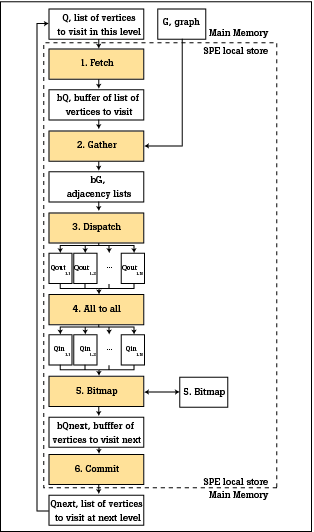 Listing Two has a major issueit assumes no limits on the size of its data structures. But the space in an LS is limitedcode, stack, global data, and heap must fit in 256 KB. Therefore, we leave Q, Qnext, and G in main memory, and operate on smaller buffers, called bQ, bQnext, and bG, respectively, which are allocated in the LS. Figure 1 describes the new algorithm.