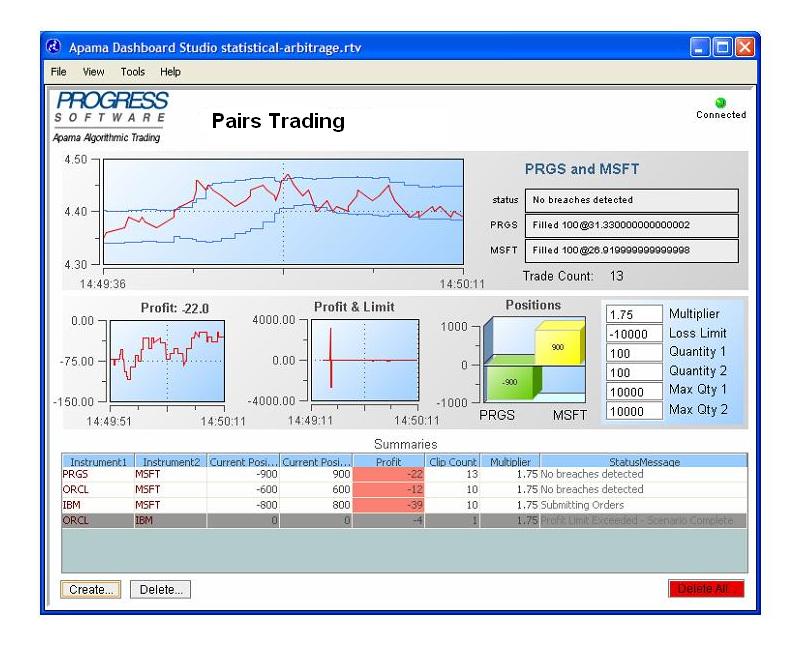 As well as graphically modeling the logic inside their algorithms, today's tools give the traders the ability to visualize, in real time, all runtime activity once their algorithm is running. Real-time "dashboards" can display representations of the changing real-time variables within the algorithms, with automatic alerts when complex conditions or exceptions are detected. Dashboard design studios and runtime rendering frameworks act as a complete design and deployment environment with a wide range of visual objects, including meters, scales, tables, grids, bar and pie charts, along with trend and x-y chartsall of which change dynamically as events occur in real time (Figure 1 shows an example of a deployed dashboard). Elements are accessible through a design palette from which the objects can be selected, placed on a visual canvas, and parameterized. This capability removes the reliance on the technical development team traditionally required for the creation and adaptation of trading strategies.