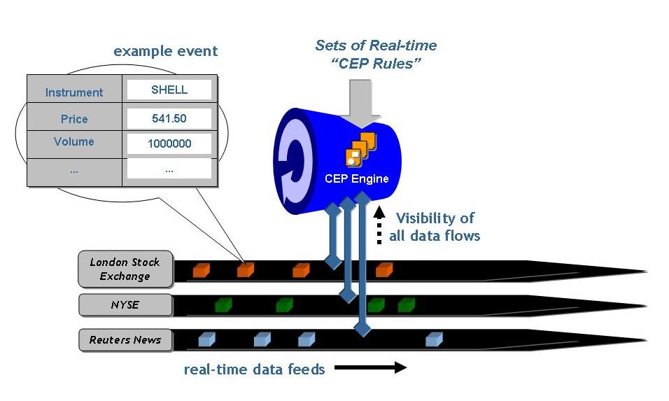 In trading, CEP takes a new approach to constructing algorithms. It is particularly suited to algorithmic trading; however, it is also suited to many other types of event-driven algorithms. CEP algorithms are structured as sets of event-based rules. These rules monitor items in incoming data streamstermed "events" (see Figure 2). Each event represents an update within the system. An example of a CEP rule is: "When the spread between the price of Shell and Exxon exceeds level x, then buy Shell and sell Exxon." Using this approach, complex algorithms can be constructed quickly. An example of a complex CEP rule is shown in Figure 3. CEP rules are hosted inside CEP engines, which efficiently monitor and execute rules. CEP engines can be permanently connected to a wide range of trading venues, so algorithms can be injected into the engine and immediately start monitoring real-time data streams, and take real-time actions on remote services.