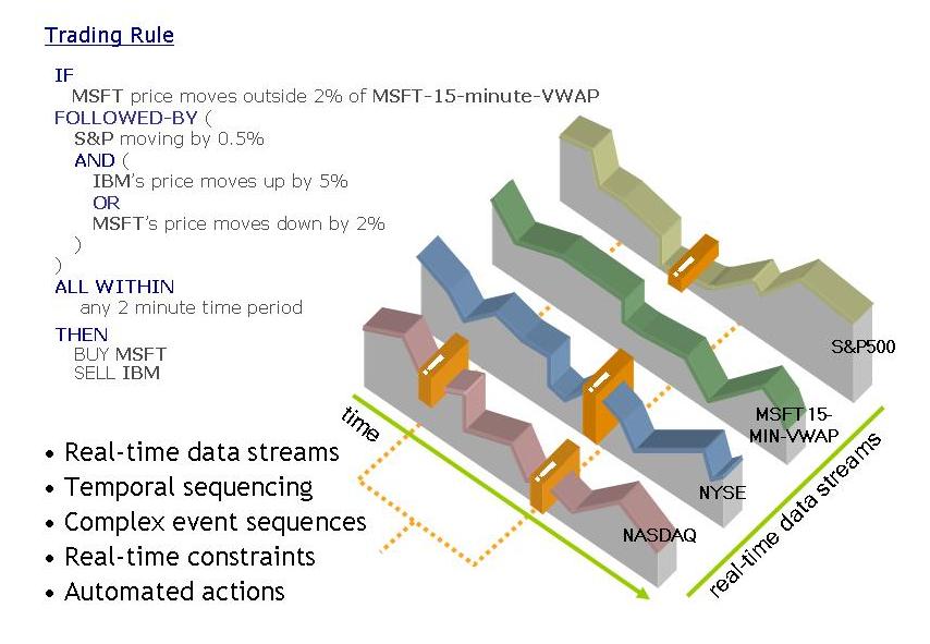In all of these approaches, Complex Event Processing offers a compelling platform for the creation and management of trading algorithms. The promise of CEP is in providing a powerful platform to enable even the nonprogrammer to encode an event-based algorithm. This year, we will see increased adoption of this approach.