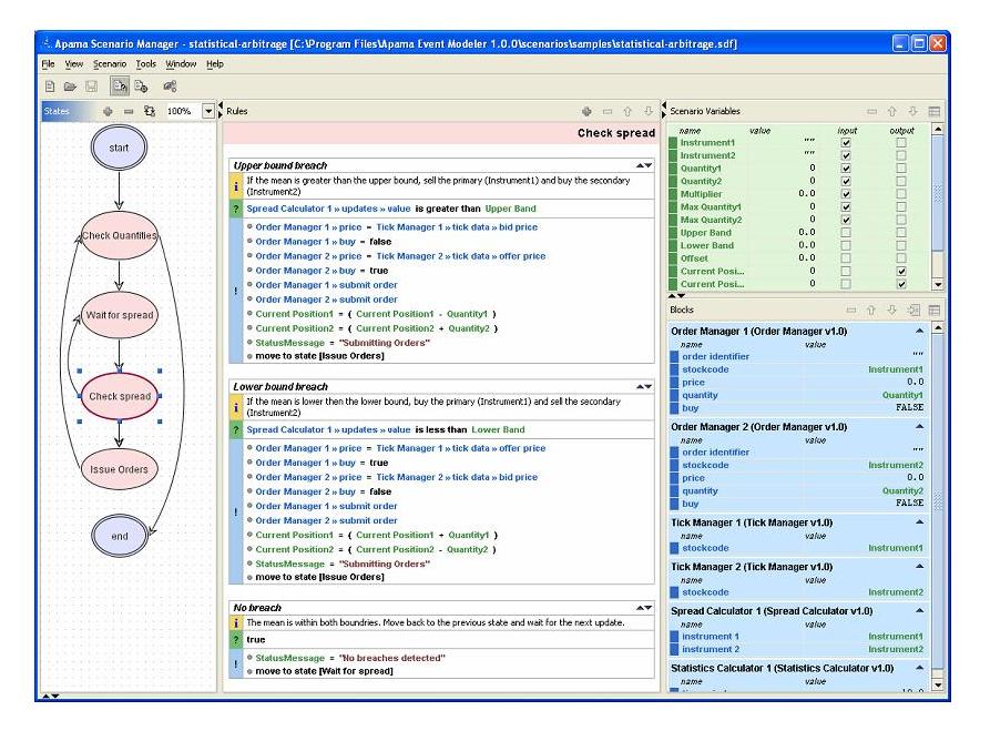 One interesting innovation that is being employed in conjunction with CEP platforms is the ability to implement new algorithms graphically. Graphical programming has always been a challenging area. Using graphical development environments to develop new programs on top of traditional languages, it can take as much time and knowledge as simply typing in the text of the language syntax. However, graphical modeling tools have been very successfully used in conjunction with CEP platforms. Modeling state flow and rules in an event-based system is well suited to graphical abstractions (see Figure 4).