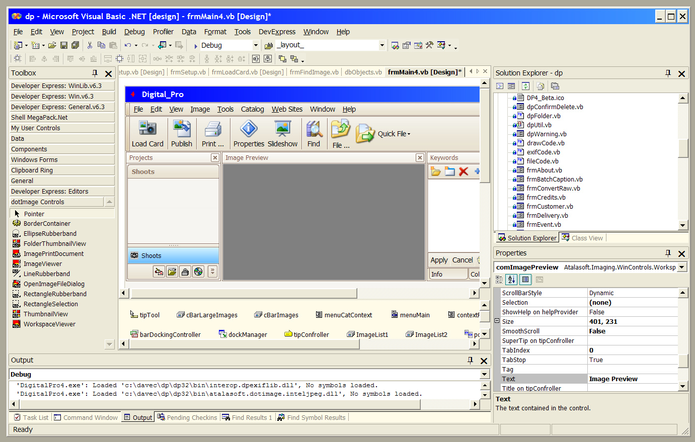 They say you can't teach an old dog new tricks, but after nearly 30 years of programming, I was excited to find that the promise of subclassing seemed to be useable in the .NET languages C# and VB. The development environment provided a combination of powerful, productive languages and an easily extensible class library system. Programming was more fun than it had been in a long time. So when we looked for a compatible imaging toolkit, it was important that it fully support the class library model, letting us extend it simply and in ways consistent with our overall architecture. Libraries using COM components wrapped in .NET are often brittle and do not permit much subclassing. In fact, many were designed as "lowest common denominator" libraries that could be used with anything from C in embedded devices up to servers. While this is an admirable design goal, desktop programmer productivity and eventual web server use were paramount for us. dotImage is great because the team at Atalasoft clearly "got" object-oriented programming and designed the system from the ground up for use with modern IDEs such as Visual Studio. In Figure 1, for instance, the dotImage controls integrate directly into the Visual Studio IDE. Frankly, we wish the procedure for updating control versions in Visual Studio was more intuitive, but that's a general issue with VS. Other than that, using the dotImage controls is as simple as drag-and-dropalthough frequently, we also create instances of their controls in code.