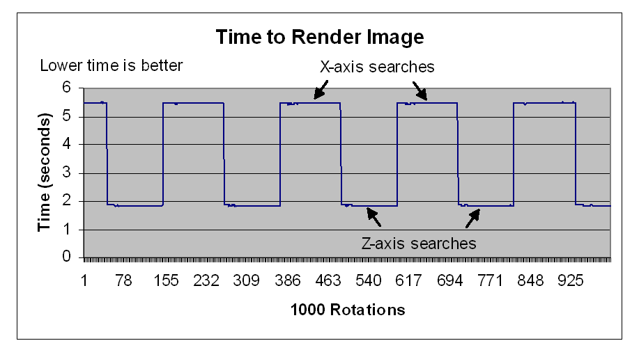 We collected Amide performance data as measured by the time required to render an image after users request to view the image from a new angle. Depending on the angle of rotation, Amide decides whether to search the image dataset from the x-, y-, or z-axis. We found the time required to display an image depended on the axis Amide selected to traverse. For example, a search along the z-axis tends to be roughly three times faster than along the x-axis, illustrated for 1000 rotations in Figure 3. We used image-rendering time as our performance metric to measure the effectiveness of our parallelization implementation.