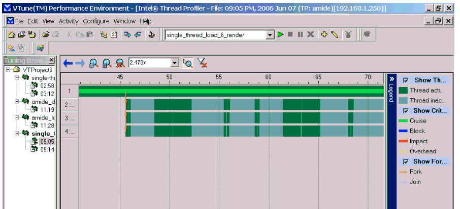 There are short periods when only two or three threads are working (CL.2 and CL.3), but these are relatively short. CL.2 and CL.3 periods are better than CL.1 periods (one thread), but not as good as CL.4 (four threads). Thread profilers typically provide more detailed views of thread stalls, and they can map thread stalls to the responsible source code.