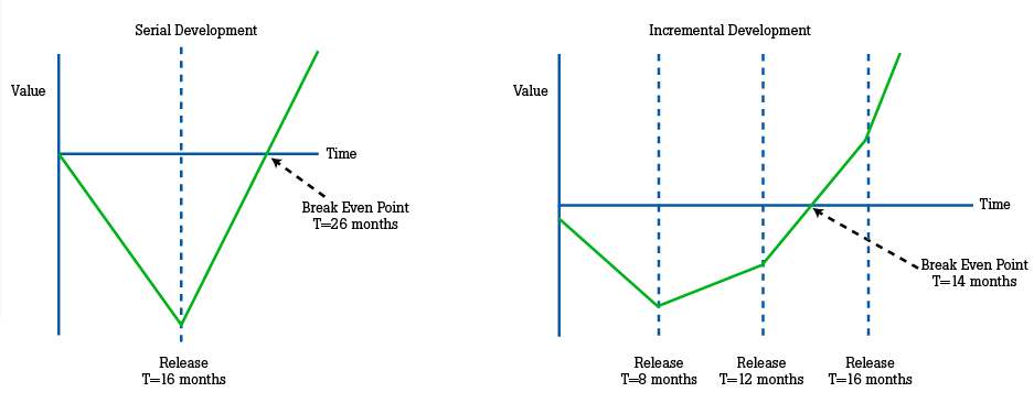 Figures 1 and 2 are two of my favorite diagrams for explaining to senior management why agile software development works. Figure 1 maps common development strategies to the cost-of-change curve (see www.ambysoft.com/essays/whyAgileWorksFeedback.html for details), very clearly showing that agile techniques are less costly than traditional techniques. Figure 2 compares the serial and incremental approaches to development, showing that the incremental approach favored by agile developers results in lower financial risk due to a shorter time-to-market and shorter payback period. Lower cost and lower risk are two issues that get management's attention.