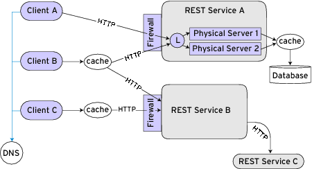 Figure 1 illustrates the REST architecture, combining both logical software architecture and physical network elements. Communication is performed over HTTP, clients contain optional server caches for efficiency, services employ caches to backend databases, there are no restrictions on maximum clients, or maximum services per client, services can call services, load-balancing hardware is used for scalability, and firewalls can be used for security.