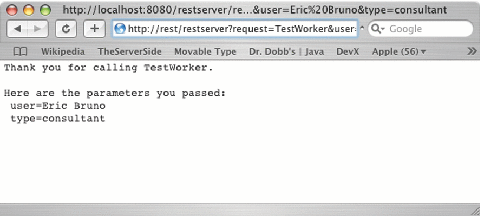 Finally, the worker object's onRequest method is called with the Map of parameters from the original HTTP request. The return value from this method (a String) is used as the response, and is returned to the web client. Therefore, your object can return HTML, comma-delimited data, XML, or a human-readable sentence. For instance, the output of a simple "echo" worker object (see Listing Four), as seen from a web browser, is in Figure 2. HTTP Requests made to this RestWorker object are sent back in the form of a paragraph that includes all of the request parameters and values.
