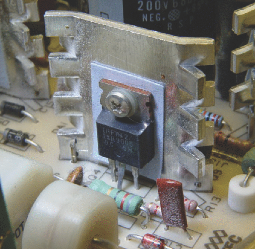 The power transistor in Figure 1 has four mechanical connections: its aluminum heatsink and three copper leads. It's firmly mounted to the heatsink with a steel screw through a plastic bushing, with a thermally conductive plastic sheet separating it from the heatsink. The center of the screw is 21 mm above the solder joints on the other side of the circuit board.