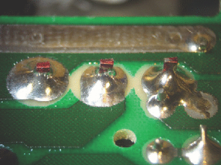 I talked to my buddy Eks, an ingenious fellow closing in on his 100th patent, and he mentioned he's seeing this problem in a disturbing number of fairly recent electronic gadgets. He drew the sketch in Figure 2 to show where the cracks occur. Figure 3 shows the nice-looking solder fillet (pronounced "fil-IT" in the metalworking trades) around each lead of a dual diode, which Eks says are typical of the failed joints he's seen. You generally cannot identify the cracked joints by eye, even under a microscope.