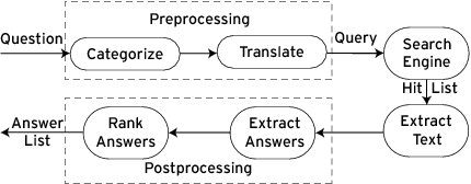 A question category represents the type of answera person, place, animal, organization, time, currency, dimension, and so on. Fine-grained question classifiers may have 30 or more different categories. The accuracy of the classifier is critical because this is the first step in the processing pipeline (Figure 1). Any errors introduced in this step are propagated to the following steps and likely lead to the extraction of a wrong answer.