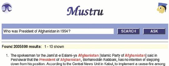 A web-based interface to search the index is included (see Figure 3). A submitted question is parsed and processed by Lucene. The best sentence from the text of each hit is returned to the client.