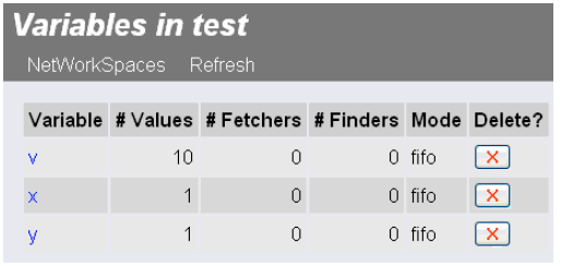 NetWorkSpaces and the variables they contain exist independently of particular client programs. Examining the contents can be helpful when debugging or understanding a program, or monitoring the progress of an application. NWS includes a web interface that displays the workspaces and their contents. Figure 1 is a list of NetWorkSpaces; if you clicked on "test," you'd see something like Figure 2. By clicking on a variable, you can see a list of the current values (Figure 3).
