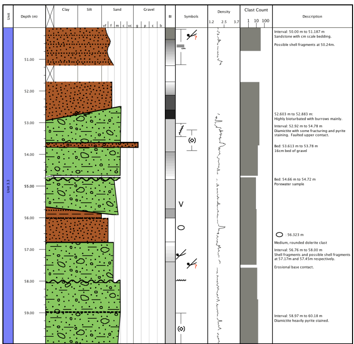 Core description is the process of documenting the cylindrical rock samples, called "cores," that result from scientific drilling. As the cores come out of the ground, they are examined and described by a team of scientists (sedimentologists) who specialize in identifying and interpreting the "stories" in the rock. The end product of this process is a series of diagrams that graphically represent the core description. These diagrams are crucial as they are the primary record of what was recovered during drilling and provide the scaffolding upon which all further scientific analysis is built.