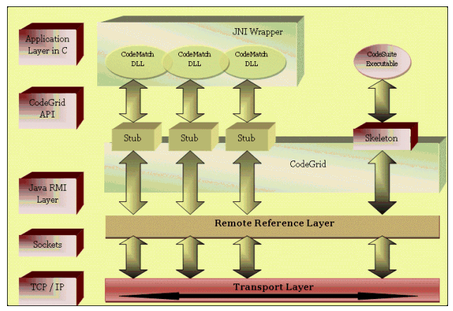 For reasons of portability and tool availability, we decided to use RMI. With RMI, objects are passed using remote method calls known as "callbacks" instead of data structures. RMI simplifies the design of the client because all it does is get a proxy for the remote object from entries in the RMI registry. It then simply calls the method in the same way it would call a local method. Since RMI is Java specific, it doesn't provide a direct connection between objects implemented in different languages. Using Java's Native Interface (JNI) API, however, it is possible to wrap existing C or C++ code such as the CodeMatch DLL with a Java interface, then export this interface remotely through RMI (see Figure 1). The JNI lets Java code that runs inside a Java Virtual Machine (JVM) interoperate with applications and libraries written in other programming languages.