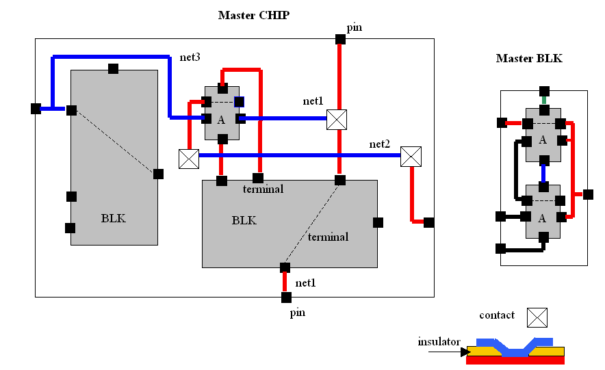 The best way to explain this problem is with a real-world example. We chose the computer-aided design of silicon chips (VLSI circuits) because it involves complex data organization with only a few classes. A fully functional computer can be on a single chip, and the data to store and traverse are hugemillions of objects. Figure 1 explains the engineering concepts of building these chips.