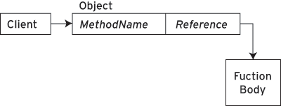 Happily, these problems can be resolved decisively. All objects in JavaScript are implemented as associative arrays that hold name-value pairs, meaning that the interpreter accesses a given object-member by using the member's name as a key with which to look up the associated value. Where the member-name corresponds to a method, the associated value is a reference to the body of that method, and it follows that calling the method causes the interpreter to retrieve the relevant reference, whence it executes the function body. Figure 1 illustrates this.
