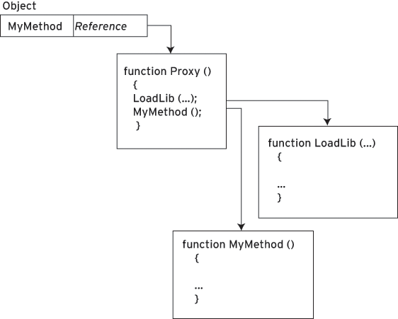 After calling the library-loader, the proxy restores the reference in the owner-object to its original value. This precludes needless performance-degradation subsequently, thus ensuring that we pay only for what we use. Note also that the proxy completes this step before invoking the interceptee, otherwise recursive calls would cause it to reexecute redundantly. Furthermore, note that JavaScript functions are objects in the "class" sense, and support a method called "call." Using this, the proxy can pass its arguments array to the original function, thus passing on any arguments supplied by the interceptee's caller and preserving transparency.