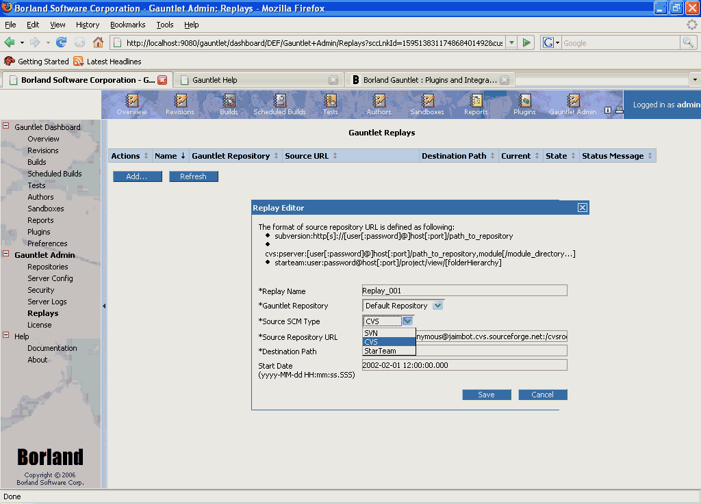Establishing a new project with Gauntlet is simple. Enter the location with proper authentication credentials of a CVS, Subversion, or Borland's own StarTeam code repository. Going a step further, Gauntlet features an impressive historical project view generator called "Replay," which identifies every code check-in made with that project before Gauntlet was employed to manage the build process, performing builds and, if configured, tests on each of these check-in points. Once Replay has been employed, its results can be used like a time machine to study the trends of a project's code history. This can be useful not only for projects currently in progress (to help estimate time and potential issues as that project continues), but also for identifying past project potholes and help developers and managers either avoid or at least plan accordingly for similar project types in the future.