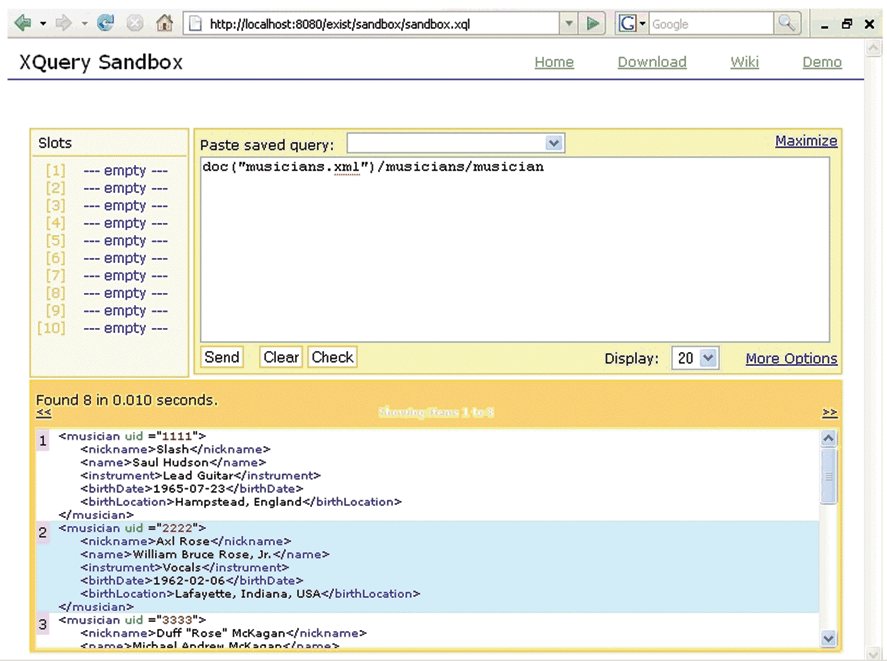 The best approach to learning XQuery is one that comes naturally to developersexamine a few examples and start writing queries. The eXist open-source native XML database (http://exist.sourceforge.net) comes with a sandbox that makes such an approach easy; see Figure 1. In the upper window, the query doc("musicians.xml")/musicians/musician searches the document contained in the file "musicians.xml" (Listing One) for all musician nodes that are children of the node named musicians. The results of the query are displayed in the lower window.