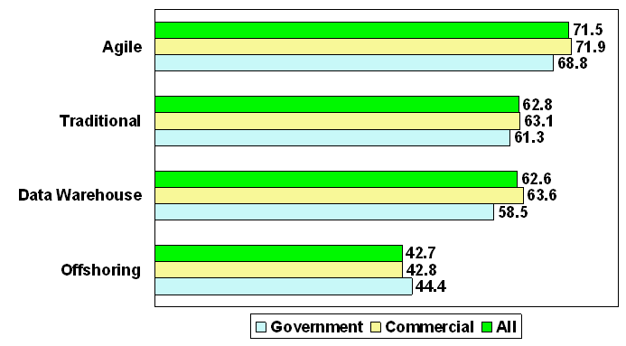 So, now that we have greater insight into what people actually consider to be IT project success criteria, how are we actually doing in practice? On average, respondents indicated that Agile projects had a 71.5 percent success rate, traditional projects 62.8 percent, data warehouse projects 62.6 percent, and offshoring projects 42.7 percent. All of these rates are a far cry from the 34 percent success rate reported by the Chaos Report.