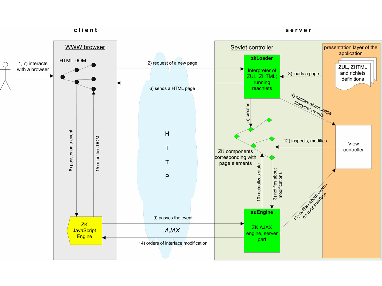 Let's say users clicked a button on the page displayed in the browser, or modified a field on a form. If a handler for this event was registered, the ZK AJAX engine notifies the server about the event. ZK receives the event on the server side, and actualizes a state of components representing page elements. Changes made by users on the form are introduced to the component tree reflecting form elements. An appropriate event handler is then called. The method can read updated data from the form, perform some operations on the database, then decide about modification of displayed data or page structure, displaying validation messages or some question directed to the user. ZK passes these orders back to the JavaScript engine working on the browser side, which executes appropriate modifications of HTML DOM.