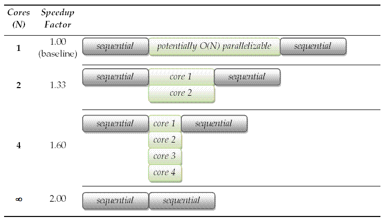 Back in 1967, Gene Amdahl famously pointed out what seemed like a fundamental limit to how fast you can make your concurrent code: Some amount of a program's processing is fully "O(N)" parallelizable (call this portion p), and only that portion can scale directly on machines having more and more processor cores. The rest of the program's work is "O(1)" sequential (s). [1,2] Assuming perfect use of all available cores and no parallelization overhead, Amdahl's Law says that the best possible speedup of that program workload on a machine with N cores is given by