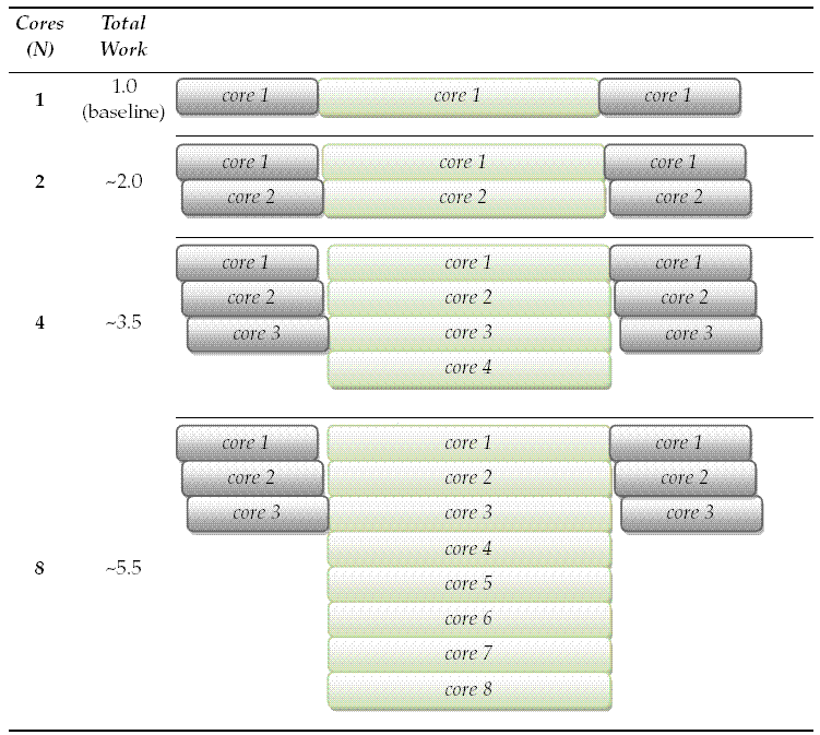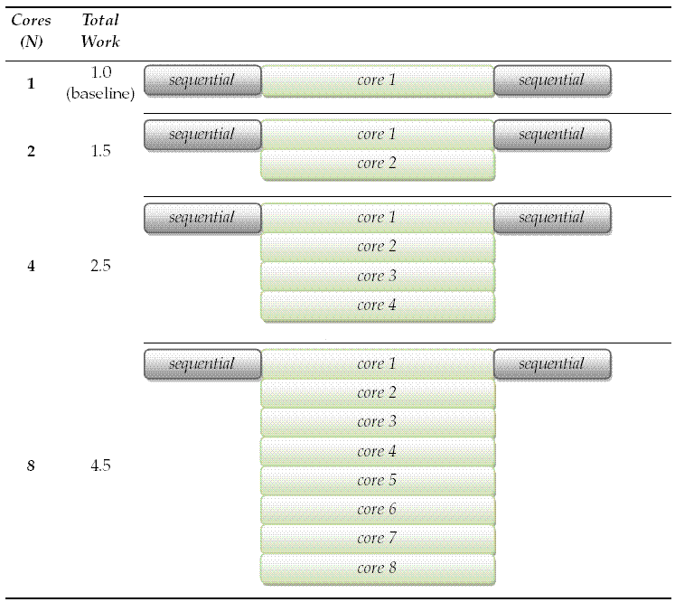 where "Total Work" is equivalent to the "best possible speedup" compared to hypothetically doing all that work sequentially, even if nobody would ever wait for such a sequential execution. For example, Figure 2 illustrates applying Gustafson's Law to the problem in Figure 1. That wonderful amplification of O(N) code just makes our parallel day. Importantly, note that the total program is now O(N), even though there is a sequential portion. As N increases to infinity, the total work we can accomplish also increases to infinity. In practice, this means that it increases until we can't make the problem any bigger or are bound on some other factor, such as memory or other I/O. Still, the key is that the concurrency is scalable, and is not hardwired to a predetermined preferred fixed number K of cores, or worse still bound by a constant factor maximum speedup over the original code as in Amdahl's approach.