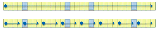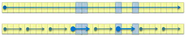 A simple P-way parallel search, where each worker explores 1/P-th of the collection, will normally be P times faster than the sequential search even in the worst case. After all, we're just searching P elements at each step instead of only one. (See the second column of Table 1.) Figures 2 and 3 show sample sequential and parallel searches side by side.