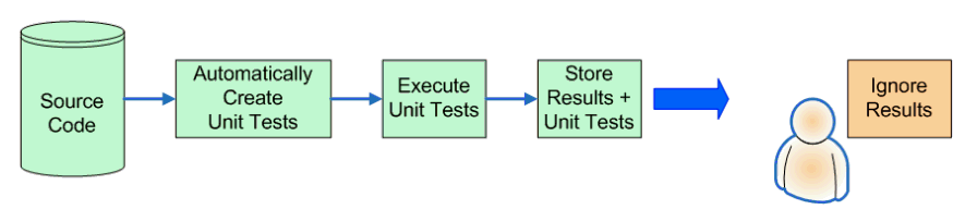 Once per project, an automated unit test generation tool scans the project code base (accessed from the source control system), then automatically generates and executes unit test cases with assertions that capture the project code's current functionality for a wide range of automatically generated test scenarios. Test execution results should be stored on a central server, where they can be shared team-wide, and the generated tests should be added to source control. At this point, you might want to fine-tune the test suite to minimize noise (by ignoring any assertions that fail on a second run against the exact same code base, ignoring time-sensitive and date-sensitive assertions, and so forth). However, such fine-tuning is completely optional at this phase.