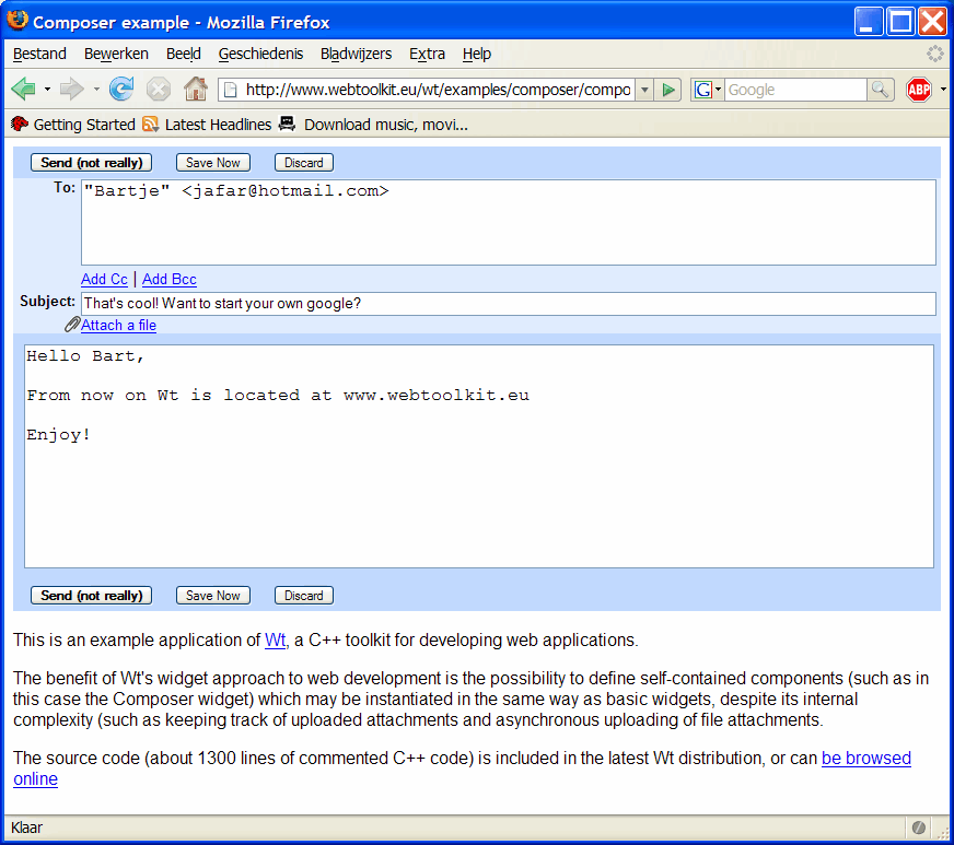 Wt is a freely available library and application server (www.webtoolkit.eu/wt) that lets C++ programmers write modern web applications using a familiar C++ GUI programming style. Wt then renders the C++ applications to the web browser. Figure 1, for instance, is a running Wt applicationa functional look-alike of the GMail composer, fully AJAX enabled, and written entirely in C++ using CSS for the markup.
