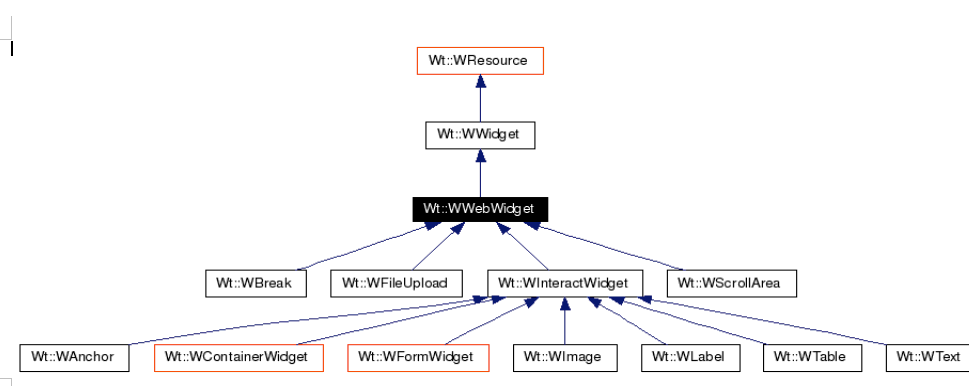 Next to WWebWidget, there is WCompositeWidget. While WWebWidgets expose as much as possible all capabilities available in their browser-side implementations, WCompositeWidgets implement advanced widget functionality whose implementation details are completely encapsulated. For example, WTreeNode, which defines a node in a tree hierarchy, is internally implemented using WImage and WText widgets laid out in a 2×2 WTable. This internal organization is not exposed by inheriting from WCompositeWidget, and can thus be changed at any point in the future.