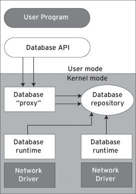 However, the kernel has generally been off-limits for database management systems because DBMS overhead (file and disk I/O, locking, cache management, and related logic) could overwhelm kernel resources and disrupt OS-critical tasks. Kernel module developers have been left to either reinvent the wheel of fundamental database capabilities for use in the kernel (albeit in a limited, lightweight fashion), or deploy a complete DBMS in user-mode space and rely on expensive (in performance terms) context switches whenever kernel-mode processes require data lookup.