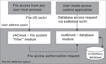 To illustrate its use, the eXtremeDB-KM distribution includes a sample application that creates a kernel-mode database to enforce access rules as part of an access-control system. The reference design includes another kernel module that intercepts filesystem calls and provides a file access authorization mechanism to the system. This "filter module" exports two types of interfaces: the "direct" API available to other kernel modules and drivers, and the "indirect" API that implements the ioctl interface to the database module.