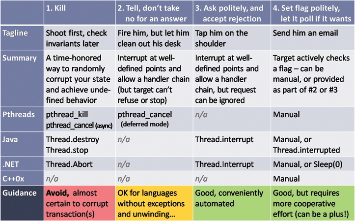 But how do you stop a thread or task you longer need or want? Table 1 summarizes the four main ways, and how they are supported on several major platforms. Let's consider them in turn.
