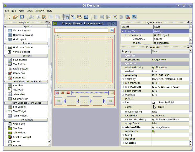 Qt comes with a UI builder tool for designing UIs. You can, of course, code the GUI by hand, but you can save time doing it in Qt Designer instead. Qt Designer stores the UI in an XML file, which generates C++ code that you can include in your project. Figure 2 shows the Qt Designer with the .ui file for Image Viewer.