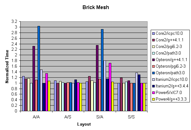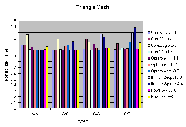 Figure 4 is also interesting. Looking at the graph, the most efficient arrangement of data is to implement the Point class as individual arrays, and the Brick connectivity class as an array of structs. Compare this to the layout where Point and Brick are both implemented as arrays of structs. The performance degradation for using a Struct-like Point class with the icpc v10.0 compiler on the Itanium2 is about 36 percent. This is surprising because many scientific applications use Struct-like Point classes almost exclusively.