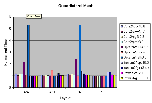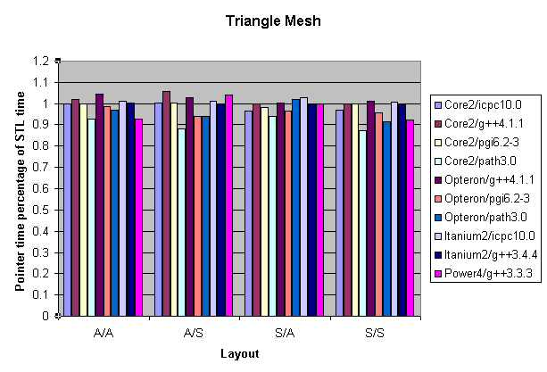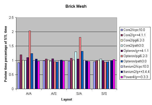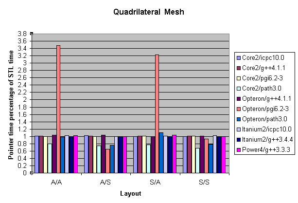 In Figures 5, 6, and 7, I plot the ratio of the Pointer time to the STL time for the Triangle, Quadrilateral, and Brick benchmarks, respectively (a value less than 1 means the naked pointers are faster). The Quadrilateral benchmark results show that the pathscale 3.0 compiler on the Opteron ran 32 percent faster on average when using restricted pointers instead of the STL. On the other hand, the g++ compiler ran slightly faster on every benchmark configuration when using the STL. I had to omit the XlC compiler from this comparison because of overly aggressive optimizations that occurred when using pointers.