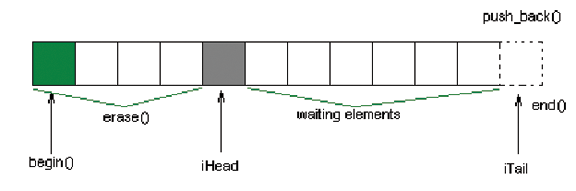 Produce() is the only method that changes the list (adding new elements and erasing the consumed elements), and it is essential that only one thread ever calls Produce()it's the Producer thread! The iterator (iTail) (only manipulated by the Producer thread) changes it only after a new element is added to the list. This way, when the Consumer thread is reading the iTail element, the new added element is ready to be used. The Consume() method tries to read all the elements between iHead and iTail (excluding both ends).
