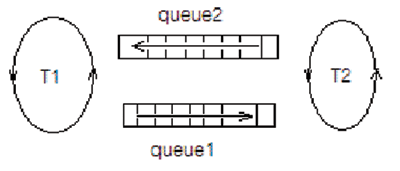 To compare the three approaches (NAIVE_POLLING, SLEEP, and TIME_WAIT), I implemented a test called "Ping-Pong" that is similar to the game of table tennis (the source code is available online). In Figure 2, there are two identical queues between the threads T1 and T2. You first load one of the queues with a number of "balls," then ask each thread to read from one queue and write to the other. The result is a controlled infinite loop. By limiting the game to a fixed number of reads/writes ("shots"), you get an understanding of how the queue behaves when varying the waiting/sleep time and strategy and the number of "balls." The faster the game, the better the performance. You should also check CPU usage to see how much of it is used for real work.