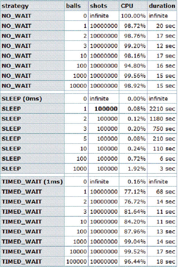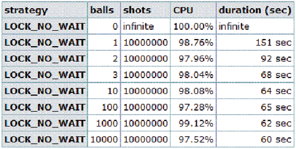 Figure 4 presents a table with the results for a classic approach (see SafeQueue). These results show that this queue is, on average, more than four-times slower than the LockFreeQueue. The slowdown comes from the synchronization between threads. Both Produce() and Consume() have to wait for each other to finish. CPU usage is almost 100 percent for this test (similar to the NO_WAIT strategy, but not even close to its performance).